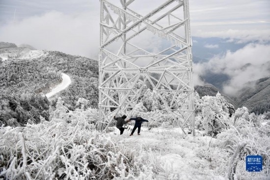 12月18日,尹斌和龍昱君在110千伏西公線001號監(jiān)測哨所觀測鐵塔和導(dǎo)線的覆冰情況。