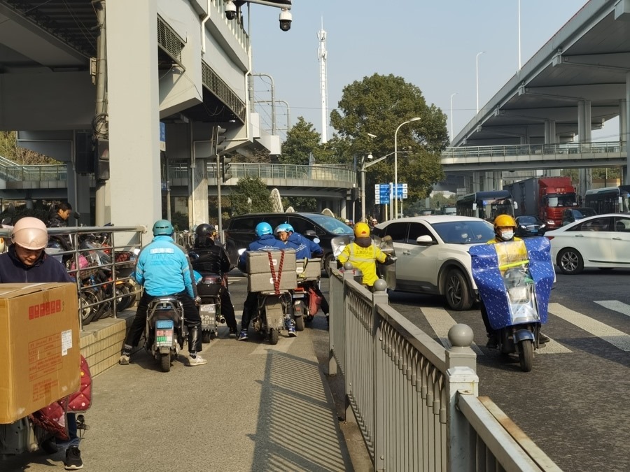 這也不是僅限青浦區(qū)。調(diào)查發(fā)現(xiàn),一些區(qū)域騎手逆行現(xiàn)象集中,背后都有平臺的“功勞”。在“12345”,有市民投訴逸仙路上騎手逆行現(xiàn)象突出,尤其是在安汾路殷高西路等路口。1月9日近中午時分,記者又來到該路段。逸仙路西側近殷高西路路口處,是名為“寶山新業(yè)坊”的商圈,外賣業(yè)務集中。記者觀察發(fā)現(xiàn),大量騎手取餐后若要向北送餐,無一例外都是直接沿逸仙路西側逆行向北,沒有騎手會向南五六百米到安汾路繞行過街后再向北。以至于逸仙路殷高西路路口南北向紅燈時,等燈的逆行騎手能排成一排。