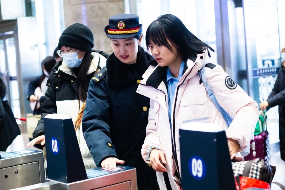北京西站客運(yùn)員協(xié)助旅客檢票進(jìn)站。新華社發(fā)(徐強(qiáng)攝)