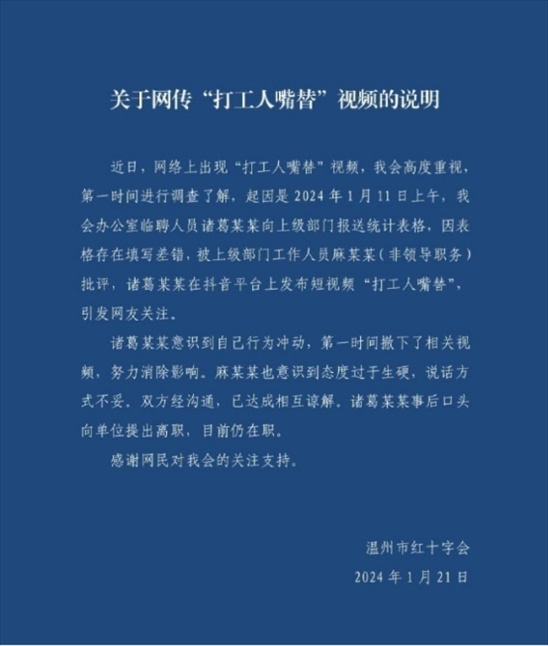 ·溫州市紅十字會回應(yīng)網(wǎng)傳“打工人嘴替”視頻:表格填錯被批評引發(fā),雙方認識到自己不足已諒解。