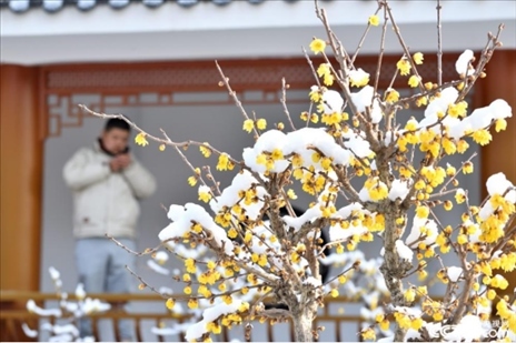 2024年1月22日,一場(chǎng)大雪過后,湖北省襄陽市??悼h蠟梅公園內(nèi)的蠟梅傲雪綻放,黃色的蠟梅和白色的積雪相映成趣,美不勝收。