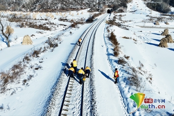 兩臺(tái)超聲波鋼軌探傷儀,在身穿橙黃色工作服的探傷工的推行下,緩緩向線路遠(yuǎn)方走去。寒風(fēng)中,探傷工們從頭到腳的防寒裝備也為他們?cè)诙臼彝庾鳂I(yè)提供了保障。