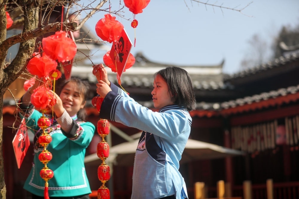 2月10日,在貴州省貴陽市烏當區(qū)偏坡布依族鄉(xiāng)偏坡村,出生于2012年的“龍寶寶”韋詩穎 (右)和家人一起在院子里掛新春飾品。新華社發(fā)(袁福洪 攝)