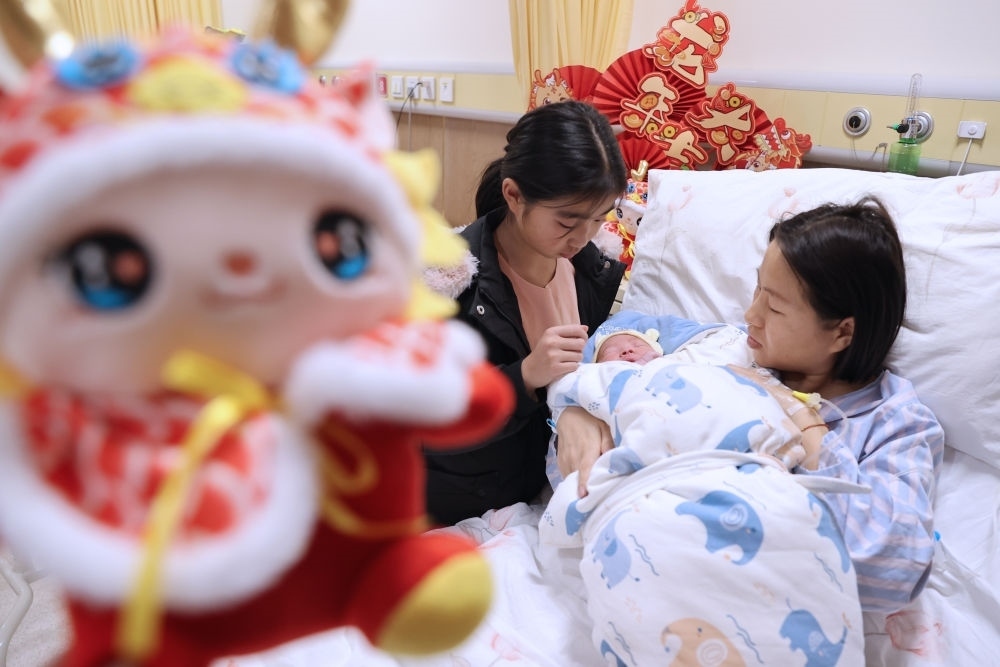 2月10日,在河北省石家莊市婦產醫(yī)院,一名剛出生的“龍寶寶”躺在媽媽懷里。新華社發(fā)(陳其保 攝)