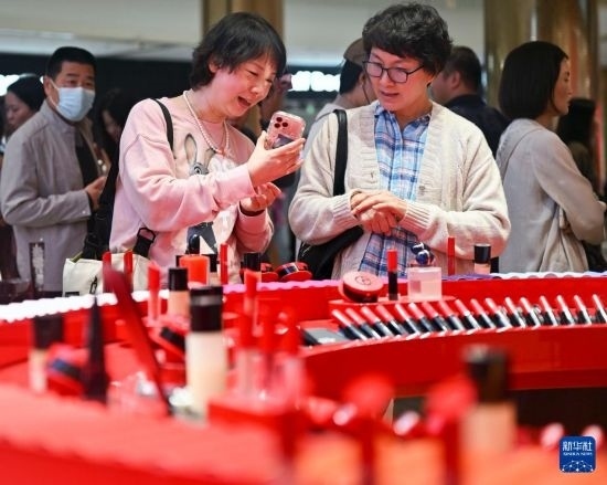 消費者在??趪H免稅城選購化妝品(2月11日攝)。