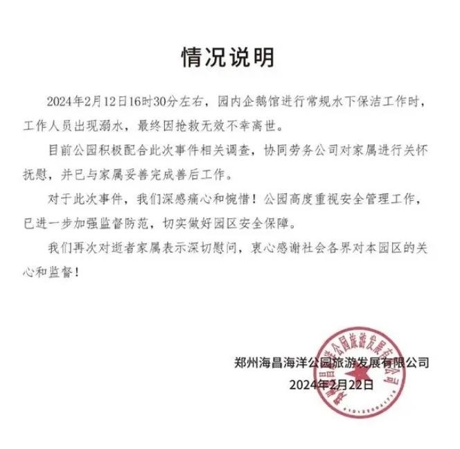 ·鄭州一海洋館潛水員在館內(nèi)溺亡,涉事公司發(fā)布情況說明:將積極配合事件調(diào)查,進(jìn)一步加強(qiáng)安全監(jiān)督。