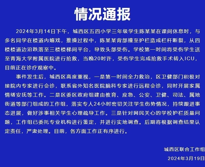央視網(wǎng)消息:據(jù)“魅力西區(qū)”微信公眾號消息,城西區(qū)聯(lián)合工作組通報,3月14日下午,城西區(qū)五四小學三年級學生陳某某在課間休息時,與多名同學在樓道內(nèi)嬉戲,推搡過程中,陳某某背部撞至護欄造成欄桿斷裂,從四樓樓道邊沿跌落至三樓樓梯間平臺,導致頭部受傷。學校第一時間將受傷學生送至青海大學附屬醫(yī)院進行搶救,當晚20時許,受傷學生完成搶救手術(shù)轉(zhuǎn)入ICU,目前正在診療觀察中。