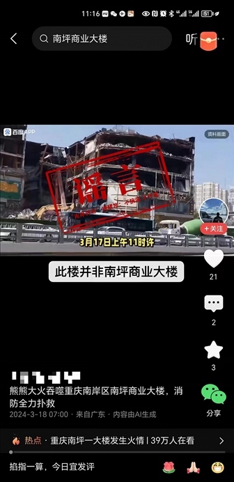 央視網(wǎng)消息:據(jù)“網(wǎng)信南岸”微信公眾號(hào)消息,3月18日,網(wǎng)傳消息稱“重慶南坪商業(yè)大樓突發(fā)大火,傷亡慘重”,有網(wǎng)友還發(fā)布了經(jīng)AI生成且圖文嚴(yán)重不符的視頻。經(jīng)核實(shí),17日11時(shí)16分,南坪商業(yè)大廈住宅著火,區(qū)消防救援支隊(duì)和南坪街道及時(shí)到場處置,11時(shí)35分,現(xiàn)場明火熄滅,無人員傷亡,未發(fā)生次生事故。南岸辟謠提醒您,不造謠、不信謠、不傳謠!