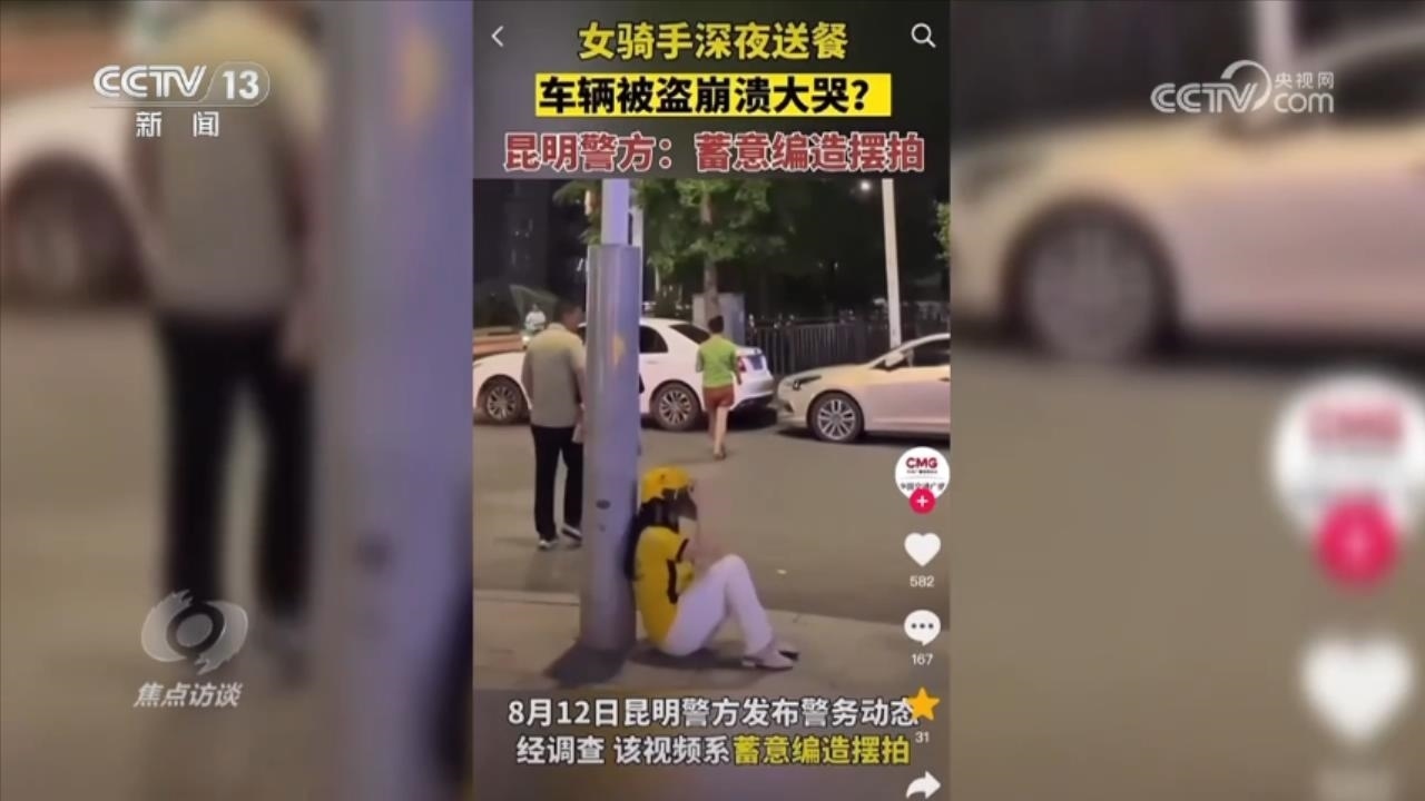 2023年8月3日,某網(wǎng)絡(luò)平臺發(fā)布了一個短視頻,除了哭泣聲,上面文字打的是“深夜,外賣姐姐送餐,下樓發(fā)現(xiàn)車被偷了”。然而,就是這樣一個時長僅10秒左右的視頻,當(dāng)晚瀏覽量已超6000萬次,并在多個平臺迅速傳播,進(jìn)入熱榜,隨即點贊、收藏量超過10萬次。同樣,這些也引起了警方的關(guān)注,經(jīng)調(diào)查核實,該視頻為擺拍,發(fā)布者就是畫面中表演的女子,其丈夫在旁負(fù)責(zé)道具和指導(dǎo)。而他們當(dāng)時擺拍的全過程被大街上的戶外監(jiān)控記錄了下來。