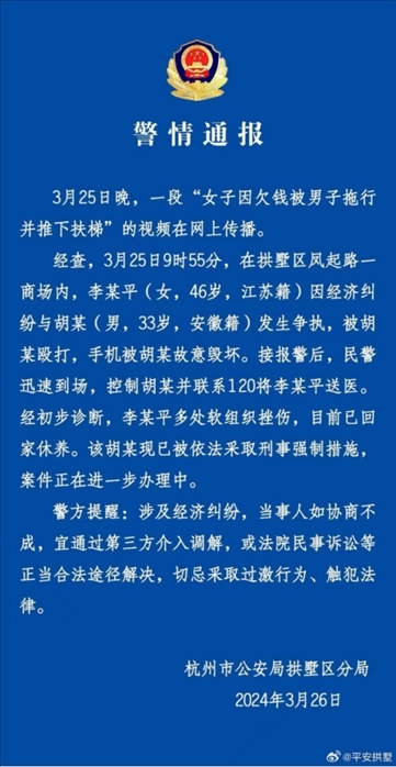 ·杭州拱墅警方通報女子被拖行推下扶梯:因經(jīng)濟(jì)糾紛起爭執(zhí),男子被依法采取刑事強制措施。