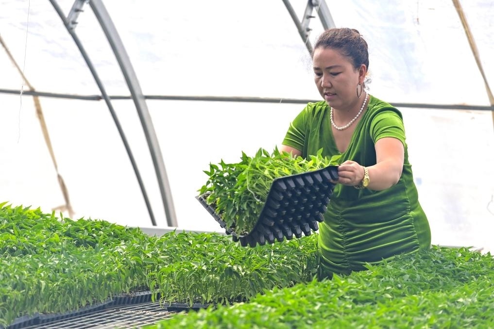 三月將盡,大漠乍暖還寒。坐落于戈壁灘邊緣的一座座溫室大棚內(nèi)滿目翠綠、暖意融融,米哈熱古麗·艾合麥提在一盤盤秧苗間麻利穿梭,額頭上的汗珠不時滾落。