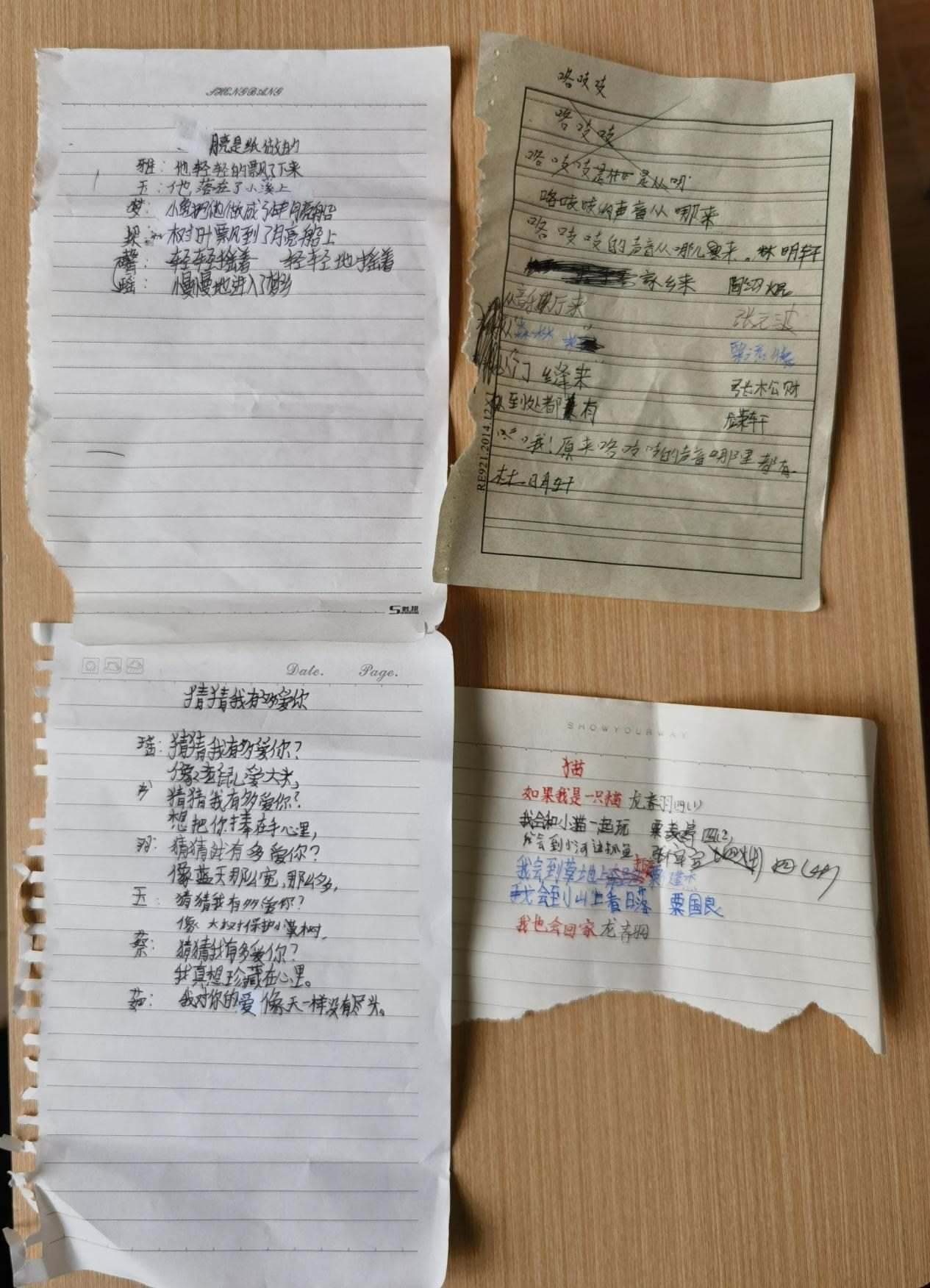 11歲的龍夢瑤是詩班里高產的一個。她在本子上擠擠挨挨寫一團字,一把撕下整頁,塞給李柏霖。這樣的紙片,李柏霖一天要收到幾十張。大大小小夾在書里,她晚上批改完,第二天再拿回學校,在課堂上分享。她估計,孩子們寫的詩已經超過2000首。