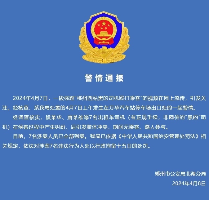 央視網(wǎng)消息:據(jù)“北湖公安局”公眾號消息,4月7日,一段標(biāo)題“郴州西站黑的司機毆打乘客”的視頻在網(wǎng)上流傳,引發(fā)關(guān)注。經(jīng)核查,系該局處置的4月7日上午發(fā)生在萬華汽車站停車場出口處的一起警情。