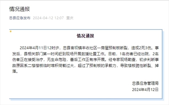 央視網(wǎng)消息:據(jù)“忠縣應(yīng)急發(fā)布”公眾號(hào)消息,重慶忠縣應(yīng)急管理局通報(bào),2024年4月11日12時(shí)許,忠縣官壩鎮(zhèn)豐收社區(qū)一房屋預(yù)制板斷裂,造成2死3傷。事發(fā)后,縣相關(guān)部門第一時(shí)間趕到現(xiàn)場開展救援處置工作。目前,1名傷者已經(jīng)出院,2名傷者正在接受治療,無生命危險(xiǎn),善后工作正有序開展。經(jīng)專家現(xiàn)場勘查,初步判斷事故原因系二樓樓板臨時(shí)堆積荷載過大,超過了預(yù)制板的承載力,導(dǎo)致樓板脆性斷裂、掉落。