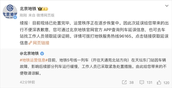 央視網(wǎng)消息:據(jù)@北京地鐵 微博消息,目前現(xiàn)場已處置完畢,運(yùn)營秩序正在逐步恢復(fù)中。此前,北京地鐵發(fā)文稱,地鐵5號線一列車(開往天通苑北站方向)在天壇東門站因車輛故障,影響后續(xù)部分列車運(yùn)行緩慢,工作人員已采取緊急處置措施。
