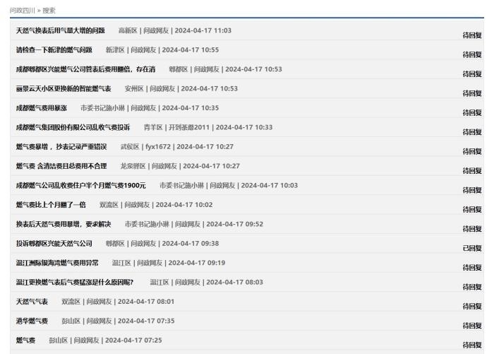 中新網(wǎng)4月17日電(中新財(cái)經(jīng)記者 吳濤)近日,在“問政四川”平臺(tái)上,不少網(wǎng)友反映“更換新表后燃?xì)赓M(fèi)異常上漲”,這些留言顯示來(lái)自四川成都、自貢、廣安、南充等多地,僅僅在4月16日,保守估計(jì)就有十幾條;17日上午又出現(xiàn)十幾條。大部分尚未得到回復(fù),部分獲得官方回復(fù)稱“留言已轉(zhuǎn)交給相關(guān)機(jī)構(gòu)進(jìn)行處理”。
