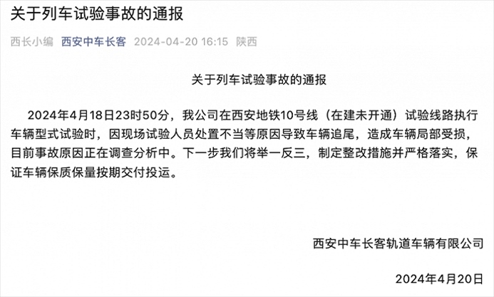 央視網(wǎng)消息:據(jù)西安中車長客官微消息,西安中車長客軌道車輛有限公司4月20日通報,4月18日23時50分,公司在西安地鐵10號線(在建未開通)試驗線路執(zhí)行車輛型式試驗時,因現(xiàn)場試驗人員處置不當(dāng)?shù)仍驅(qū)е萝囕v追尾,造成車輛局部受損,目前事故原因正在調(diào)查分析中。下一步將舉一反三,制定整改措施并嚴(yán)格落實,保證車輛保質(zhì)保量按期交付投運。