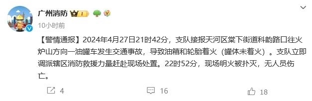 廣州一油罐車發(fā)生交通事故致油箱著火 無人員傷亡