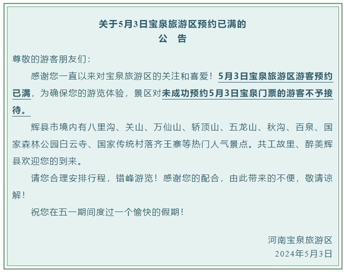 央視網(wǎng)消息:據(jù)“河南寶泉旅游區(qū)”公眾號(hào)消息,景區(qū)發(fā)布公告,5月3日寶泉旅游區(qū)游客預(yù)約已滿,為確保游覽體驗(yàn),對(duì)未成功預(yù)約5月3日寶泉門票的游客不予接待。