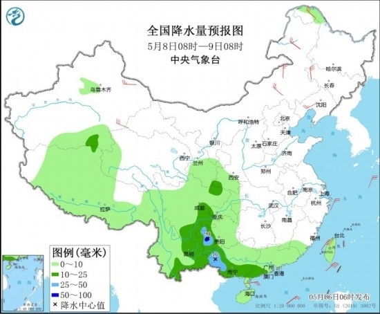 全國降水量預(yù)報圖(5月8日08時-9日08時)