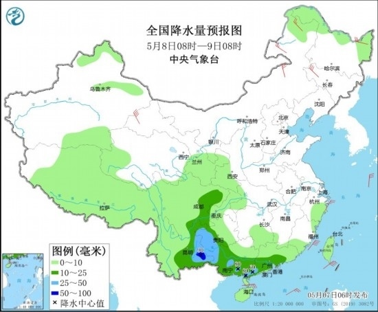 全國降水量預(yù)報(bào)圖(5月8日08時(shí)-9日08時(shí))