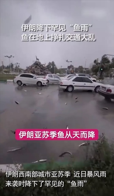·近日,伊朗亞蘇季市暴風(fēng)雨來(lái)襲時(shí),天空降下罕見(jiàn)“魚雨”。