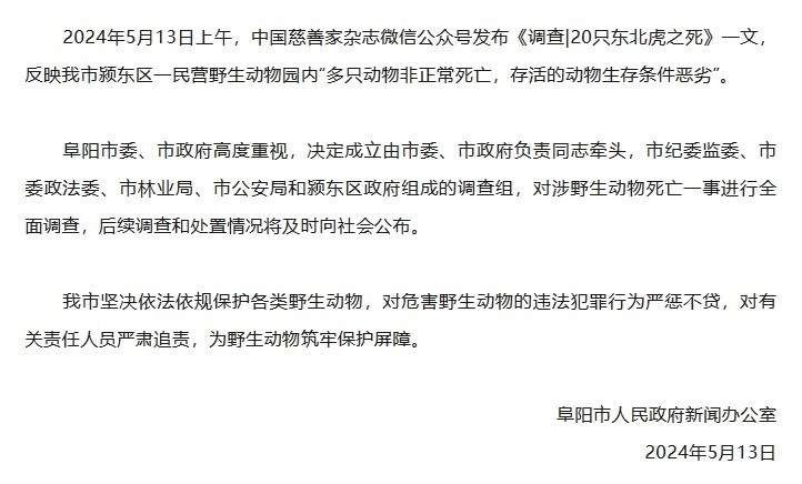 央視網(wǎng)消息:據(jù)“阜陽發(fā)布”微信公眾號(hào)消息,阜陽市人民政府新聞辦公室發(fā)布情況通報(bào),2024年5月13日上午,中國(guó)慈善家雜志微信公眾號(hào)發(fā)布《調(diào)查|20只東北虎之死》一文,反映阜陽市潁東區(qū)一民營(yíng)野生動(dòng)物園內(nèi)“多只動(dòng)物非正常死亡,存活的動(dòng)物生存條件惡劣”。