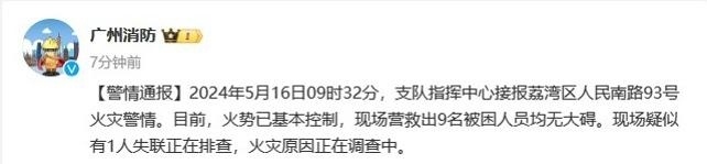 央視網(wǎng)消息:據(jù)廣州消防微博消息,2024年5月16日09時(shí)32分,廣州市消防支隊(duì)指揮中心接報(bào)荔灣區(qū)人民南路93號火災(zāi)警情。目前,火勢已基本控制,現(xiàn)場營救出9名被困人員均無大礙?,F(xiàn)場疑似有1人失聯(lián)正在排查,火災(zāi)原因正在調(diào)查中。