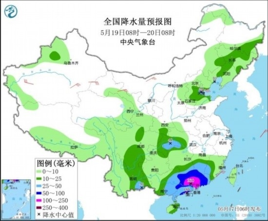 圖3 全國降水量預(yù)報圖(5月19日08時-20日08時)