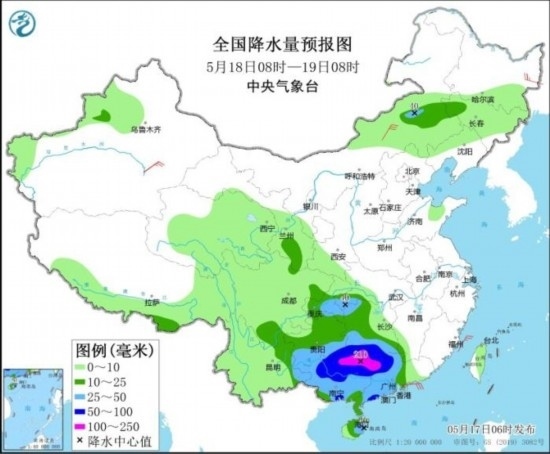 圖1 全國降水量預(yù)報圖(5月17日08時-18日08時)