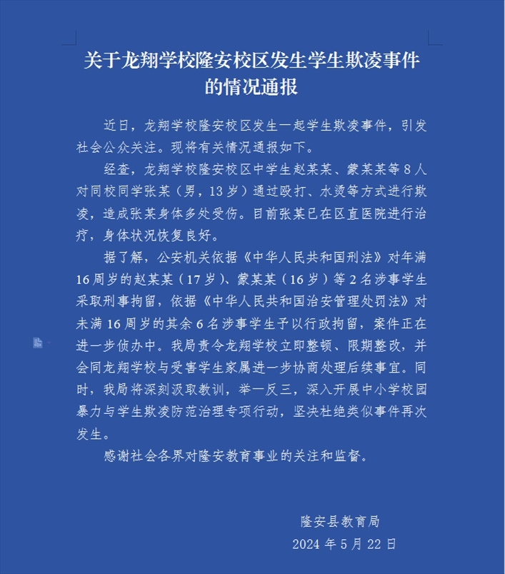 ·廣西隆安通報(bào)學(xué)生遭毆打水燙欺凌:2學(xué)生刑拘、6學(xué)生行政拘留。