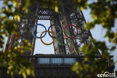 當(dāng)?shù)貢r(shí)間2024年6月7日,在巴黎奧運(yùn)會(huì)開幕倒計(jì)時(shí)50天之際,奧運(yùn)五環(huán)被安裝在巴黎埃菲爾鐵塔上。