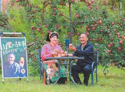 四川省小金縣沃日鎮(zhèn)木欄村,電商主播同果農(nóng)一起直播賣蘋果。嚴易程攝(人民視覺)
