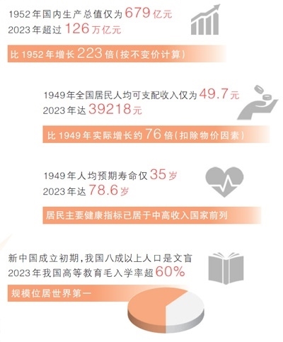 各行各業(yè)的發(fā)展成就,人民生活的蒸蒸日上,濃縮在一組組數(shù)據(jù)中。與新中國成立初期相比,2023年國內(nèi)生產(chǎn)總值增長223倍、人均GDP增長89倍、人均預(yù)期壽命提高43.6歲、農(nóng)村貧困人口全部脫貧……國家統(tǒng)計局近日發(fā)布新中國成立75年經(jīng)濟社會發(fā)展成就系列報告,“數(shù)”說75年偉大成就,本版“大數(shù)據(jù)觀察”欄目推出特別報道,記錄同心同德、艱苦奮斗的奮進歷程,匯聚共襄強國建設(shè)、民族復(fù)興偉業(yè)的磅礴力量。