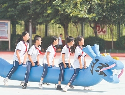 近年來,廣西梧州將大象拔河、竹竿舞、打陀螺等民族體育項(xiàng)目引進(jìn)課堂,讓學(xué)生在享受運(yùn)動快樂的同時(shí),接受民族團(tuán)結(jié)進(jìn)步教育。圖為近日當(dāng)?shù)匾凰W(xué)的學(xué)生體驗(yàn)“旱地龍舟”。