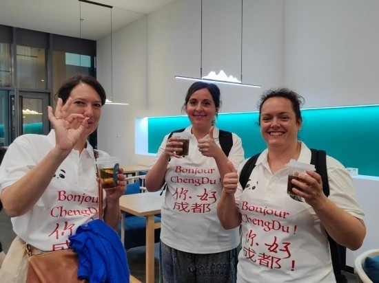 7月13日,在品嘗中藥茶飲后,三名法國中醫(yī)藥愛好者表示非常滿意。新華社記者 董小紅 攝