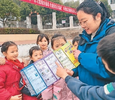 在湖南省江永縣實(shí)驗(yàn)小學(xué),該縣農(nóng)商銀行工作人員為小學(xué)生宣講網(wǎng)絡(luò)金融知識(shí)。潘百旺攝(人民視覺(jué))