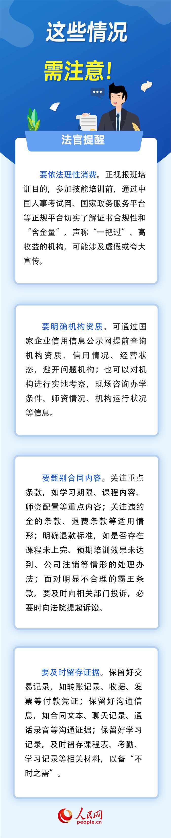 為掌握更多知識技能,“報培訓(xùn)班”成為越來越多人的選擇。然而,部分培訓(xùn)機(jī)構(gòu)虛假宣傳、半路關(guān)門、拒不退費(fèi)等套路讓消費(fèi)者防不勝防。如何識別培訓(xùn)報班中的“陷阱”、維護(hù)自身權(quán)益?對此,人民網(wǎng)采訪了北京市通州區(qū)人民法院法官助理李志峰。(高清揚(yáng) 實(shí)習(xí)生 李澤華)