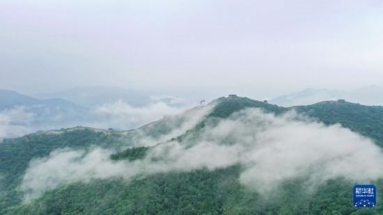 云霧繚繞的慕田峪長城(8月3日攝,無人機照片)。