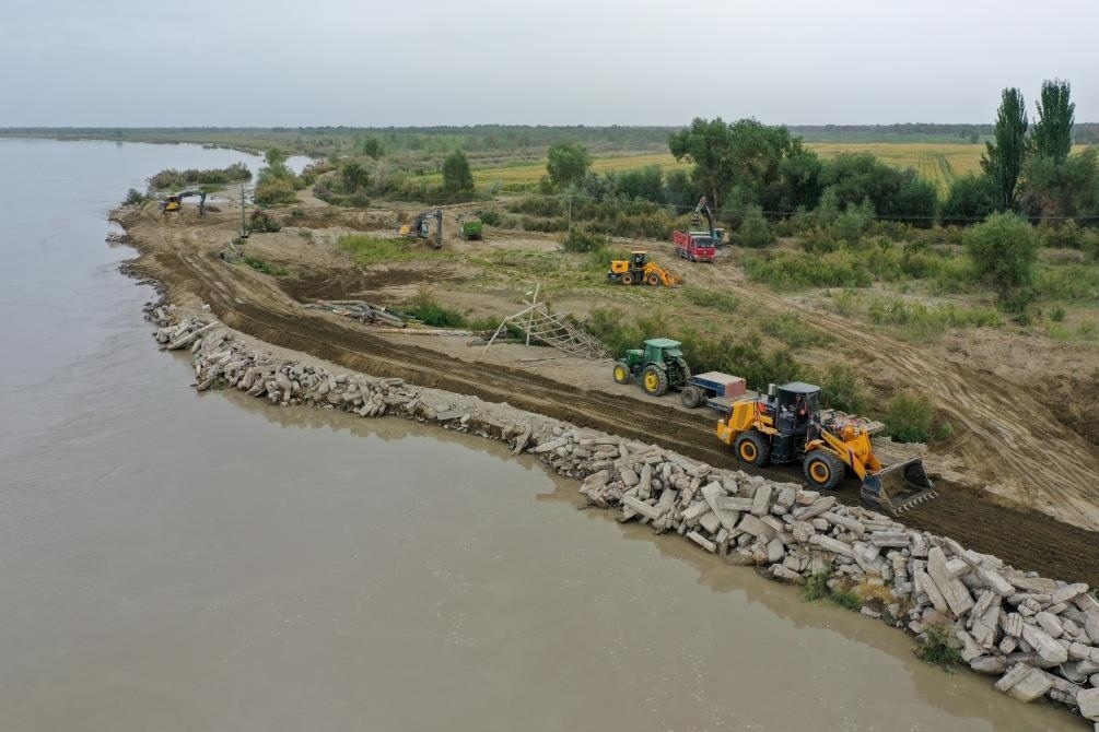 “這一區(qū)域是‘幾’字形的回水灣,距離最近的農(nóng)田不足50米?!鄙w孜庫木鄉(xiāng)黨委書記艾力江·阿布來提說,為確保群眾生命財產(chǎn)安全,當(dāng)?shù)剜l(xiāng)村兩級干部和黨員共230人組成7支搶險隊,輪流值守防汛一線,并投入35輛大型機械進(jìn)行堤壩除險加固。