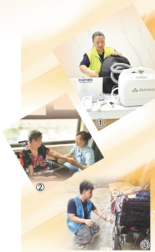 圖①:老年助浴員肖琳在店里收拾設(shè)備,準(zhǔn)備上門(mén)為老人助浴。冷智梅攝 圖②:健康照護(hù)師劉馳在為耿守愛(ài)老人進(jìn)行護(hù)理。本報(bào)記者 朱佩嫻攝 圖③:適老化改造評(píng)估師鐘晉軒在測(cè)量曾炳成老人的輪椅扶手高度。本報(bào)記者 洪秋婷攝