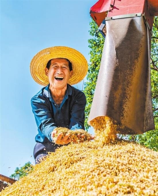 10月10日,湖南省東安縣紫溪市鎮(zhèn)中心村,農(nóng)民在高標(biāo)準(zhǔn)農(nóng)田收獲晚稻。今年前三季度,全國夏糧早稻產(chǎn)量合計17795萬噸,比上年增加346萬噸,增長2.0%。蔡小平攝(中經(jīng)視覺)