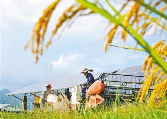 10月15日,浙江省樂清市勝利塘內(nèi)的“農(nóng)光互補”光伏發(fā)電項目基地,農(nóng)戶將收割好的稻谷裝袋。蔡寬元攝(中經(jīng)視覺)