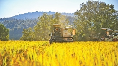 江西黎川縣的稻田里,收割機在前,“吞”入一串串飽滿的稻穗;村民在后,將一簇簇稻草扎成稻草束,整齊地立在田里晾曬。