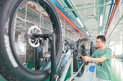 江西省九江經(jīng)濟技術(shù)開發(fā)區(qū)九江馳暢車業(yè)有限公司生產(chǎn)車間內(nèi),工人正在組裝銷往歐美市場的新能源助力自行車。魏東升攝(人民視覺)