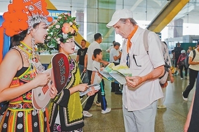 在云南昆明長水國際機場舉行的南華野生菌推介活動上,工作人員向外國友人介紹野生菌產品。南華縣委宣傳部供圖