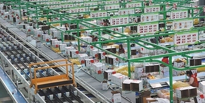 陜西洛川縣一家果業(yè)企業(yè)的蘋果包裝生產線,工作人員正在進行包裝作業(yè)。李 進攝