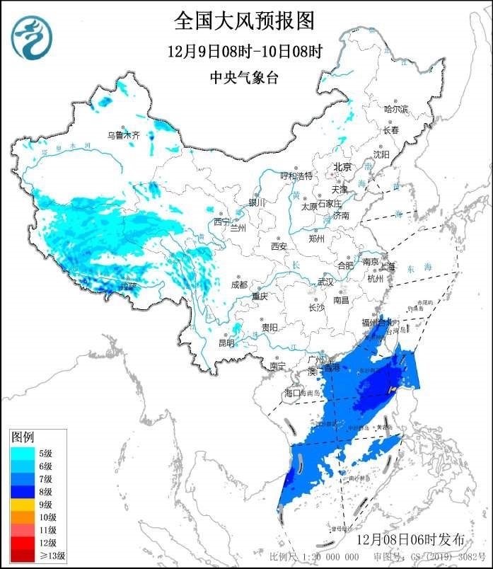 12月9日08時至10日08時,西藏中西部、青海西南部、川西高原、新疆北部地區(qū)將有5~6級風(fēng),西藏中西部局地風(fēng)力可達7~8級;臺灣海峽、臺灣以東洋面、巴士海峽、南海西北部、中部和西南部海域?qū)⒂?~8級、陣風(fēng)9級的大風(fēng),其中巴士海峽部分海域的風(fēng)力可達9級、陣風(fēng)10級。