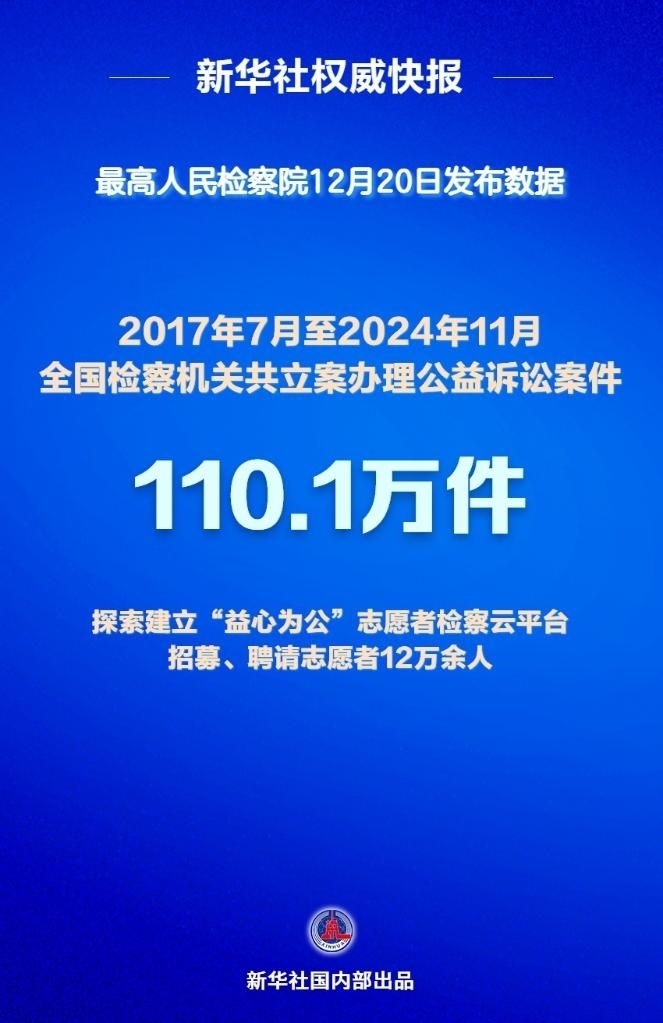 最高人民檢察院12月20日發(fā)布檢察公益訴訟有關(guān)情況顯示,2017年7月至2024年11月,全國檢察機關(guān)共立案辦理公益訴訟案件110.1萬件,其中行政公益訴訟案件98.9萬件,民事公益訴訟案件11.2萬件。