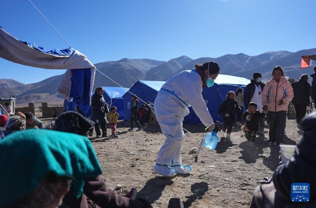1月8日,在定日縣措果鄉(xiāng)野江村安置點(diǎn),醫(yī)護(hù)人員進(jìn)行消殺。